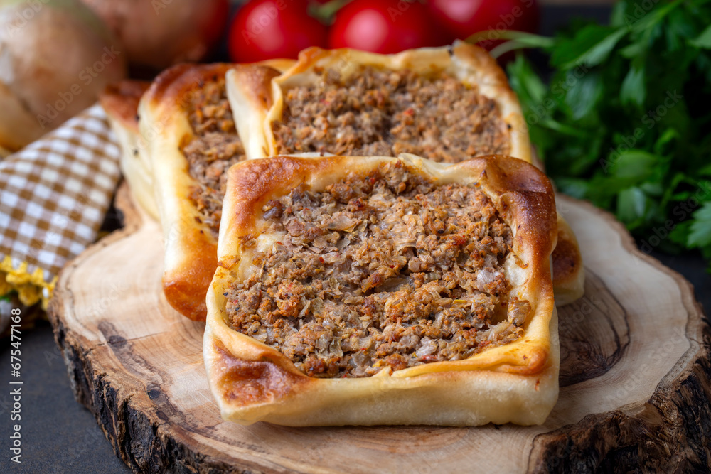Traditional delicious Turkish foods; Kaytaz pastry with minced meat of Turkey Hatay - Antakya region (Turkish name; Kaytaz boregi)