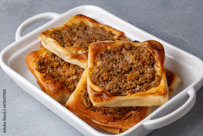 Traditional delicious Turkish foods; Kaytaz pastry with minced meat of Turkey Hatay - Antakya region (Turkish name; Kaytaz boregi)
