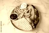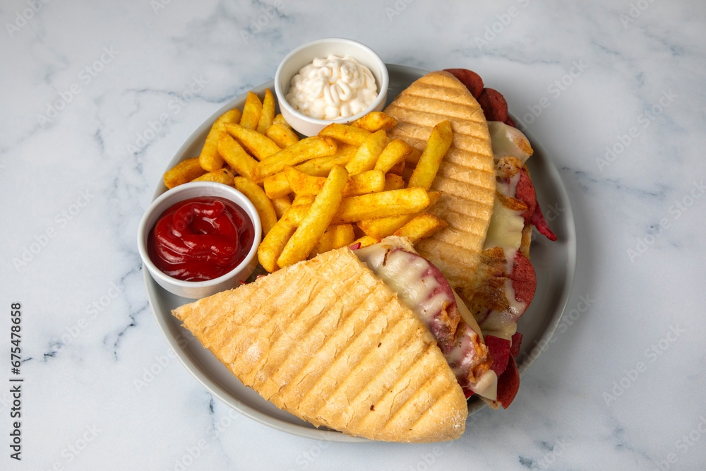 Turkish toast, mixed toast with cheddar cheese, sausage and ham, with fried potatoes (Turkish name; Karisik tost)