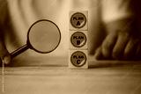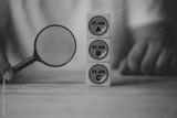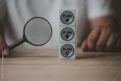 Man use a magnifying glass with decision to plan A, B or C. Decision a planing concept. Think of smart ideas with problem solving concept.