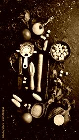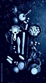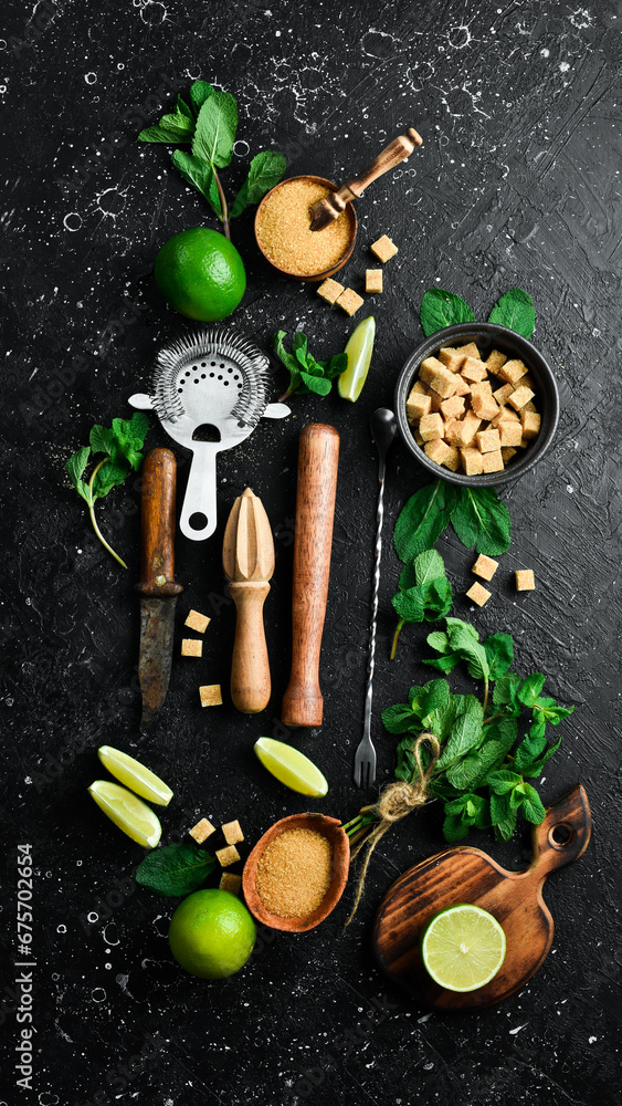 Barware and ingredients for making a Mojito cocktail. On a black background. Top view.