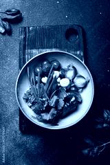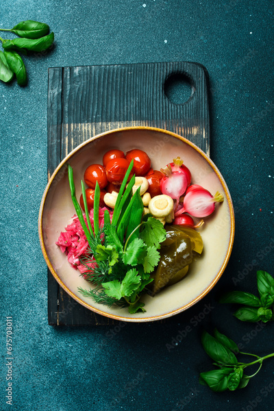 Pickled vegetables: cabbage, cucumber, tomato. Close up. on a plate On a black stone background.
