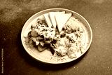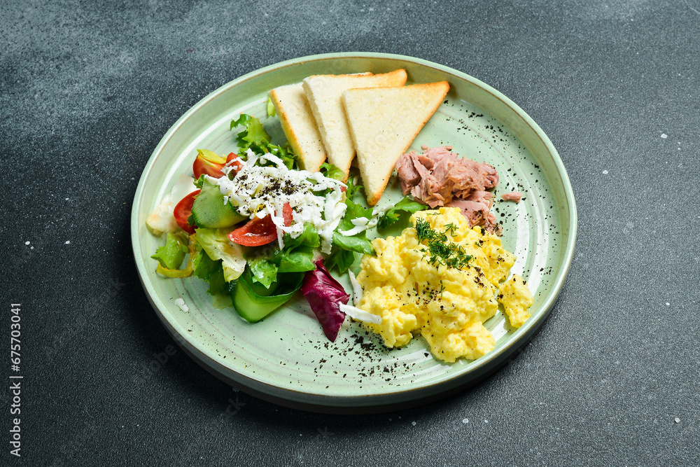 Breakfast. Plate with scrambled eggs, tuna, salad and toast bread. On a black stone background. Free space for text.