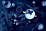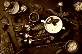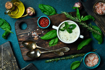 Soup made of meat and cream in a white bowl. Free space for text. Close up.