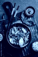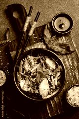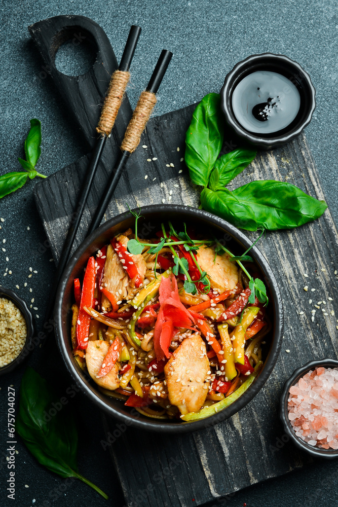 Udon pasta with chicken and ginger. In a black plate. Japanese cuisine. On a dark background, close-up.