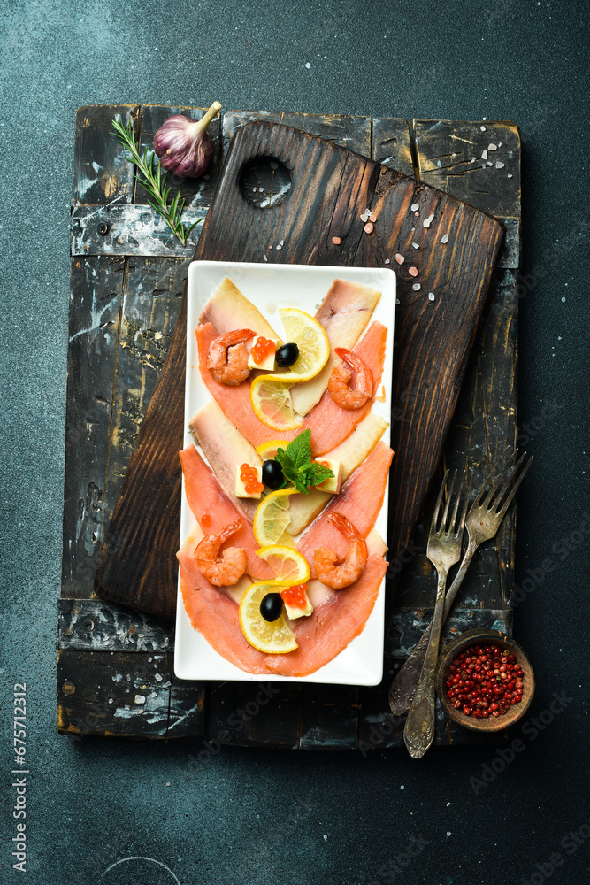 Salted salmon, shrimp and caviar with butter and lemon. Appetizer. On a dark stone background. Free space for text.