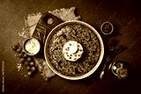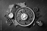 Olivier salad. Salad of green peas, boiled vegetables and mayonnaise. Close-up, gray background.