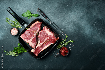 Raw T-bone Steak with fresh herbs on the pan is ready for cooking. A piece of veal.