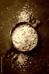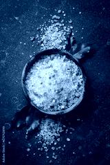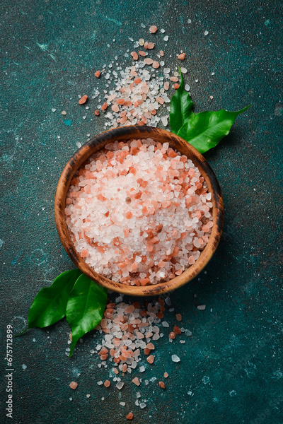 Himalayan coarse sea salt in a wooden bowl. On a dark textured background. Copy space.