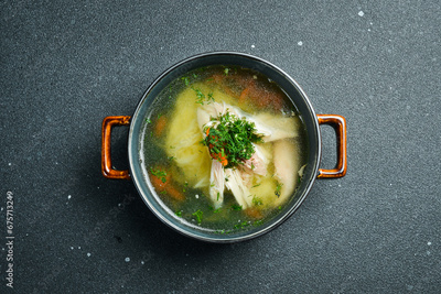 Homemade chicken broth with chicken and pasta. On a dark stone background.
