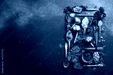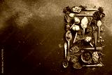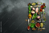 Variety of spices and herbs on kitchen table. Top view. Free space for text.