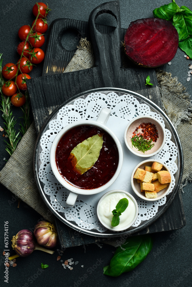Borsch soup. Beet soup in a white bowl. Free space for text. Close up.