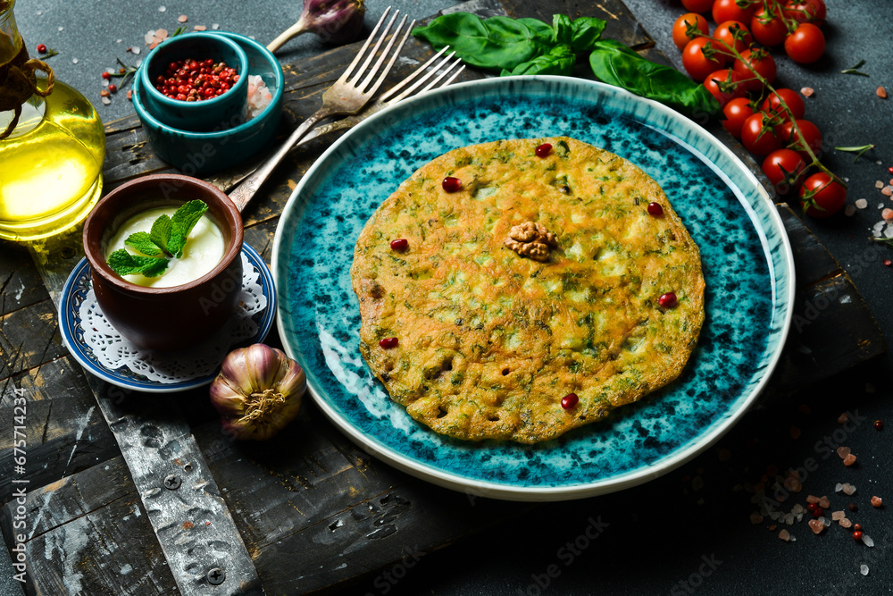 traditional Azerbaijan pancake with greens and salty yogurt. Free space for text. On a dark background.