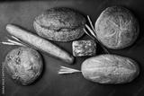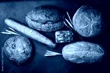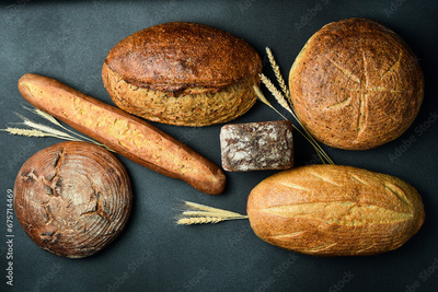 Background of bread and pastries. Assortment of bread on a black stone table. Top view.