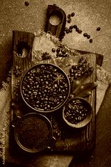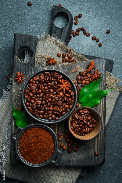 Coffee beans and ground powder on stone background. Top view with copy space for your text