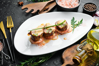 Baked pork medallions with cheese sauce and spices. Restaurant menu. Rustic style.