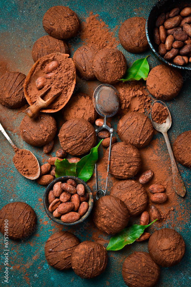 Chocolate brown cookies with cocoa beans. Side view. On a dark background.
