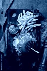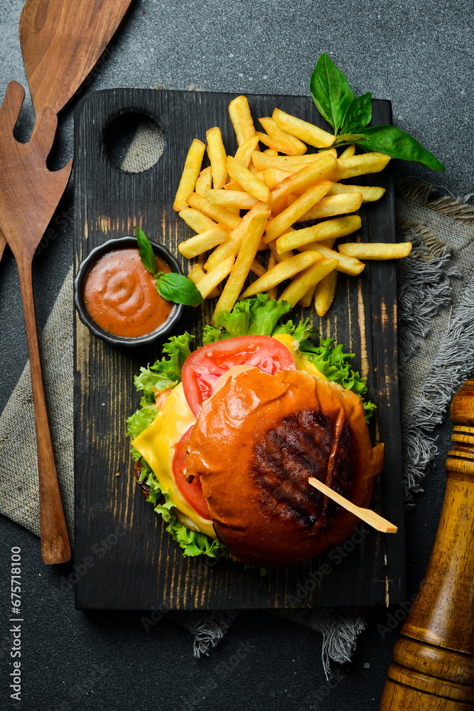 Traditional hamburger and fries with ketchup. Fast food. On a dark background, close-up.