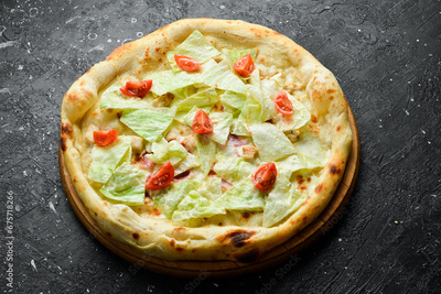 Caesar pizza with chicken. classic pizza On a black stone background. Top view.