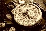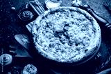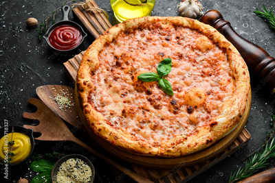Pizza margherita. classic pizza On a black stone background. Top view.