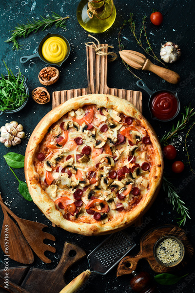 Pizza with Bavarian sausages, mushrooms and cheese. classic pizza On a black stone background. Top view.