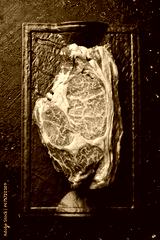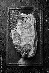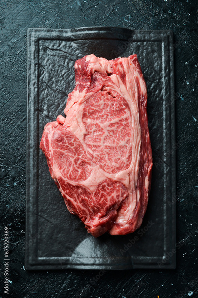 Raw marbled ribeye steak. Fresh meat and spices. Top view On a black stone background. Rustic style.