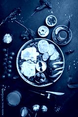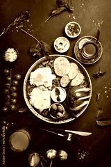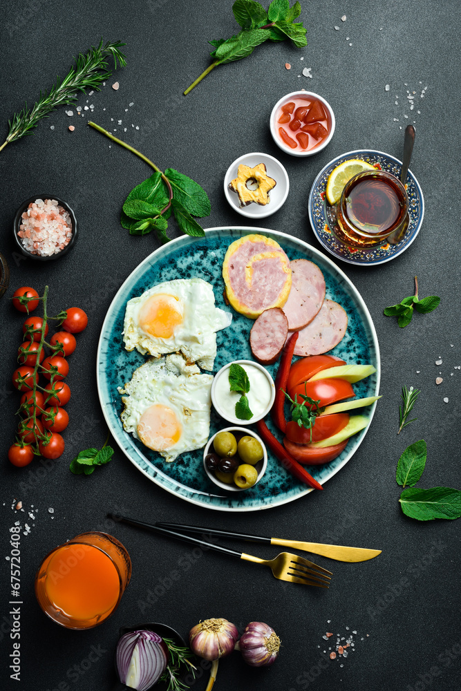 English breakfast. Fried eggs, salami, bacon and vegetables. Tea and sweets. On a dark slate background.
