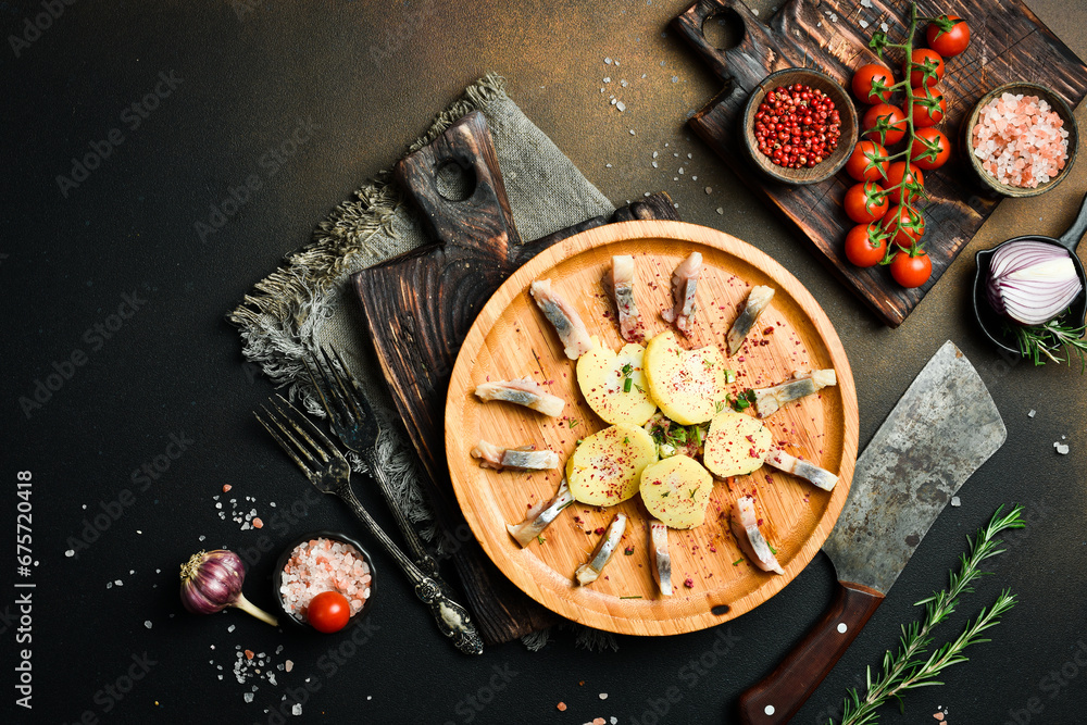 Salted herring with onions and potatoes. On a wooden plate. On a dark slate background.