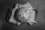 Homemade black bran round bread. Fresh bread on a black background. Top view.