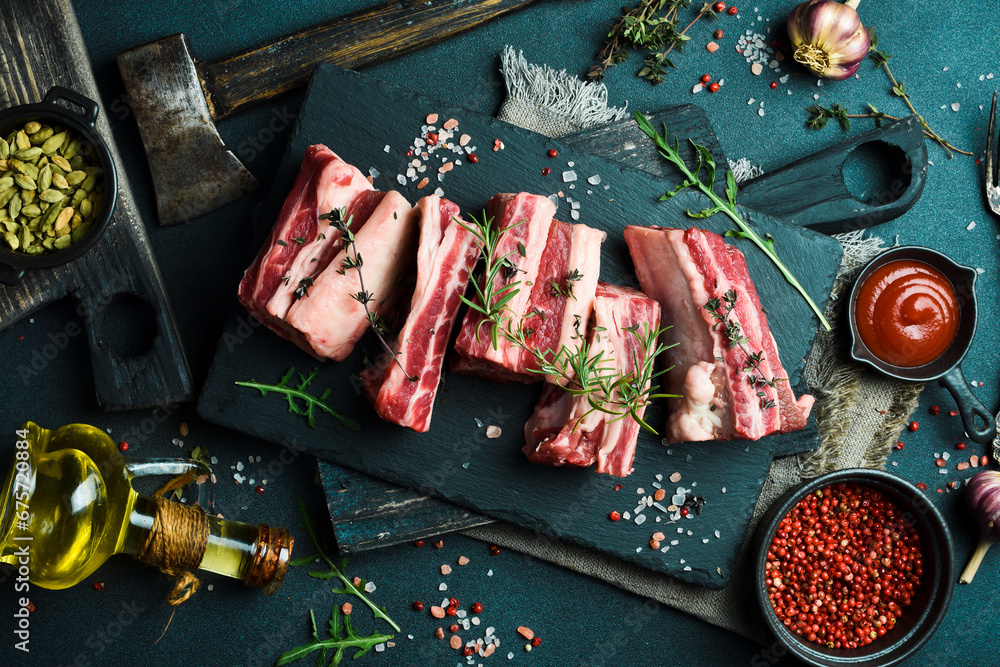 Fresh raw veal ribs with rosemary, spices and herbs. On a dark slate background. Top view. Free space for text.