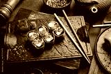 sushi rolls with salmon, kale leaves, and cream cheese. Served with wasabi sauce and pickled ginger. Japanese traditional food. Close up.