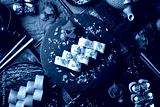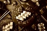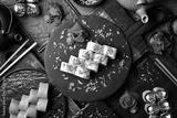 Japanese sushi with fish and cheese on a rustic dark background. Sushi rolls, nigiri, maki, pickled ginger, wasabi, soy sauce. Sushi set on a table.