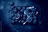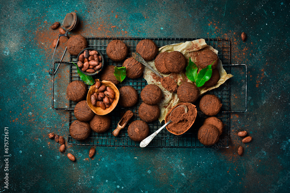 Truffle with cocoa and chocolate. On a dark background. Top view.
