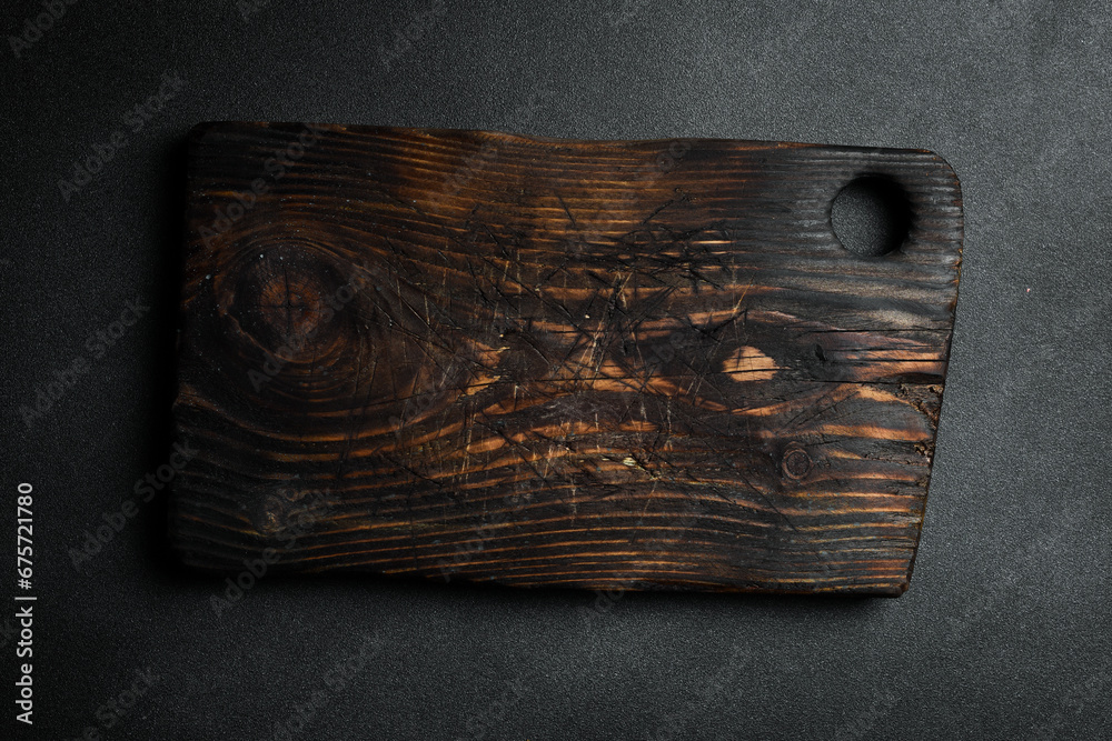 Kitchen brown wooden cutting board. On a dark slate background. Free space for the recipe.