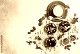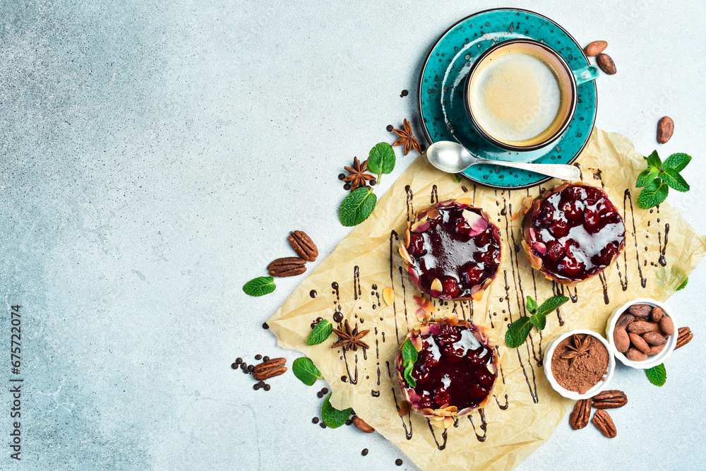 Dessert, pastry and a cup of coffee. Cherry brownie with cherry jam. On a gray stone background. Top view.