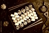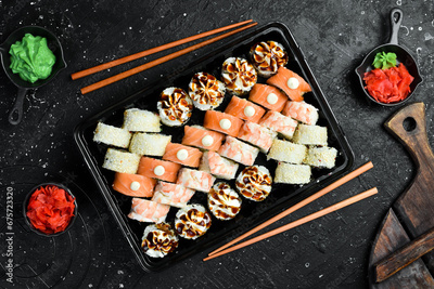 Sushi delivery. Sushi rolls with cheese and fish. Disposable tableware. On a wooden board.