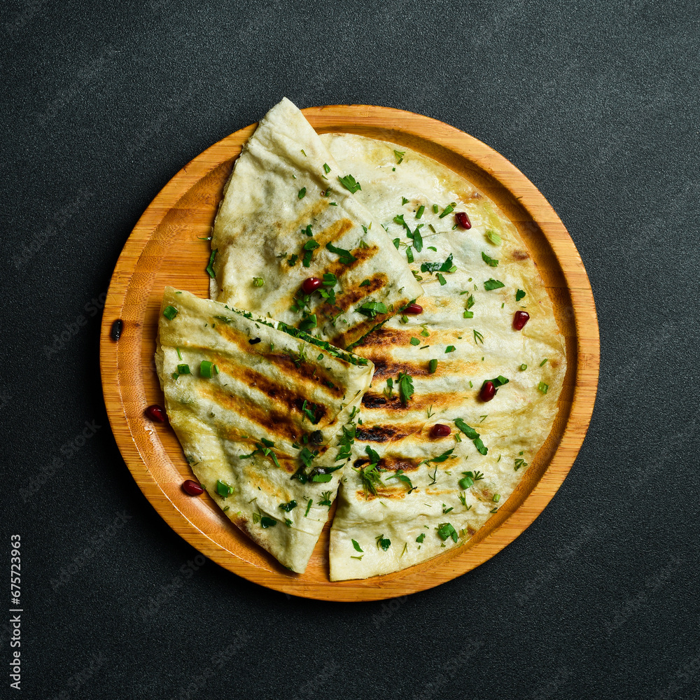 Traditional azerbaijan cuisine flat bread with herbs and meat. Kutaby qutab kutab. Free space for text. On a dark background.