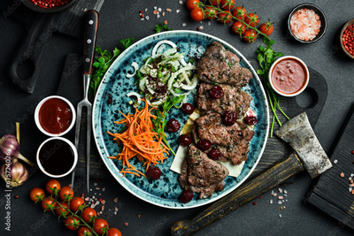 Grilled veal with cherries with onions and pita bread. Barbecue menu. Free space for text. Close up.