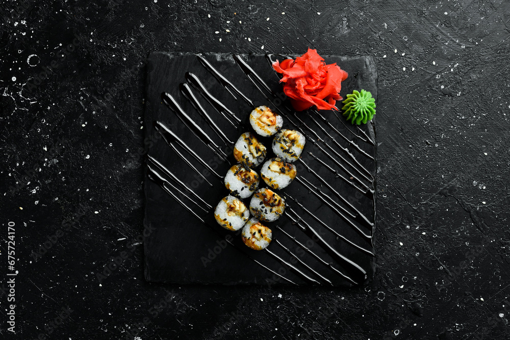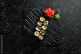 Classic sushi rolls with fish. Japanese food. On a black stone background. Top view.