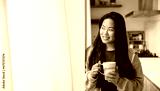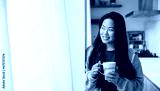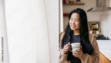 Young beautiful woman with a mug drinking coffee next to a window in a kitchen. Smiling woman enjoying a coffee break at home.