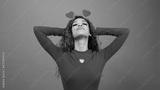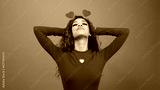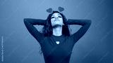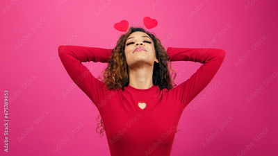 Zen woman stretches arms behind head, breathes, meditate self love, Valentine