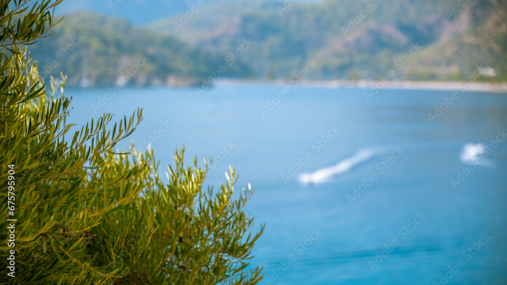 Olive tree on the seashore with beautiful landscape on the background with mountains and boat