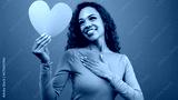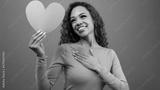 Beautiful young woman in love, hugging heart self love, pink studio Valentines