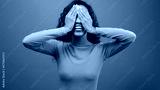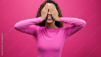 Laughing woman covers eyes as surprise for Valentine's Day, pink studio