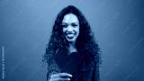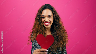 Cute multi-ethnic woman poses with paper hearts, symbol of love studio Valentine