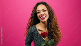 Beautiful multi-ethnic woman smells red rose, laughing and smiling, pink studio