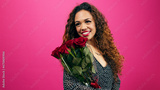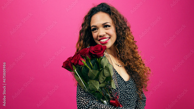 Beautiful multi-ethnic woman holds bunch of red roses, romance, pink studio