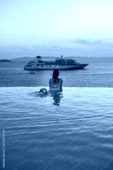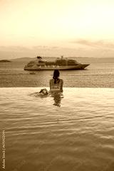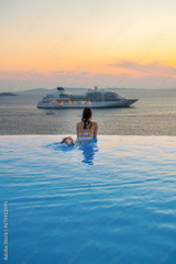 Woman enjoys at infinity pool at the sunset time, Mykonos, Greece