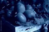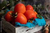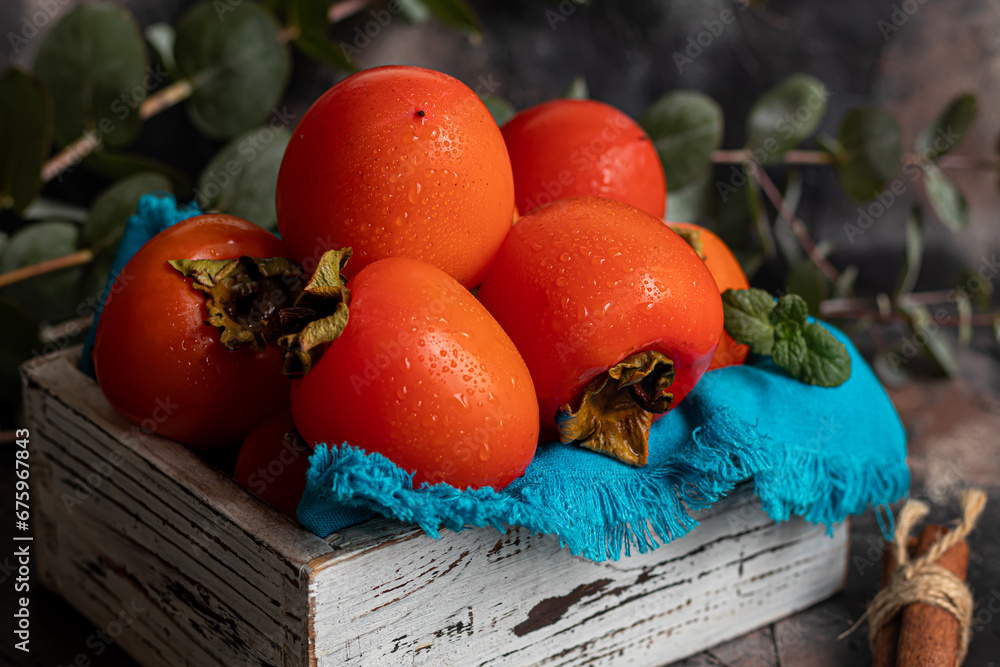 Persimmon on a dark background. Fresh, ripe fruits on a blue plate and in a box. Healthy eating.