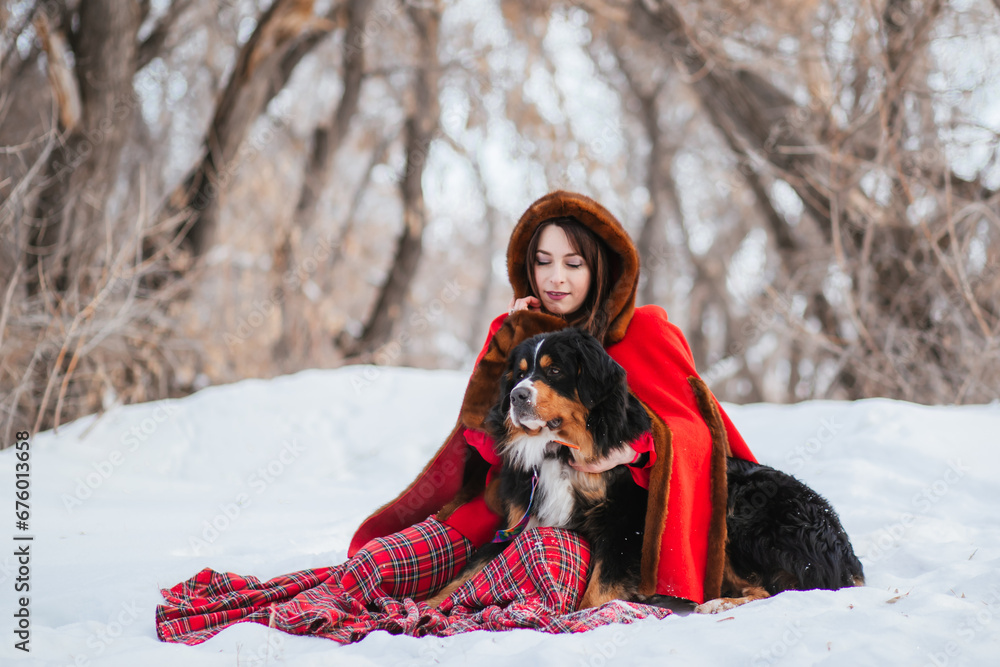 woman in winter in an ancient red coat and plaid skirt in winter in the snow with a dog of the Bernese Mountain Dog breed. Fairytale image of Little Red Riding Hood with a big dog.